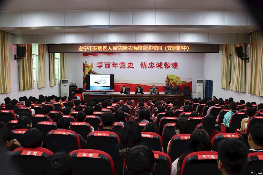 10月15日,安居区人民法院助理法官陈庆、向琪一行来到安居职中,开展以“网络侵权与校园贷”为主题的法治教育专题讲座。校团委、学生会、“9+3”学生代表、班干部代表200余人现场参加培训。