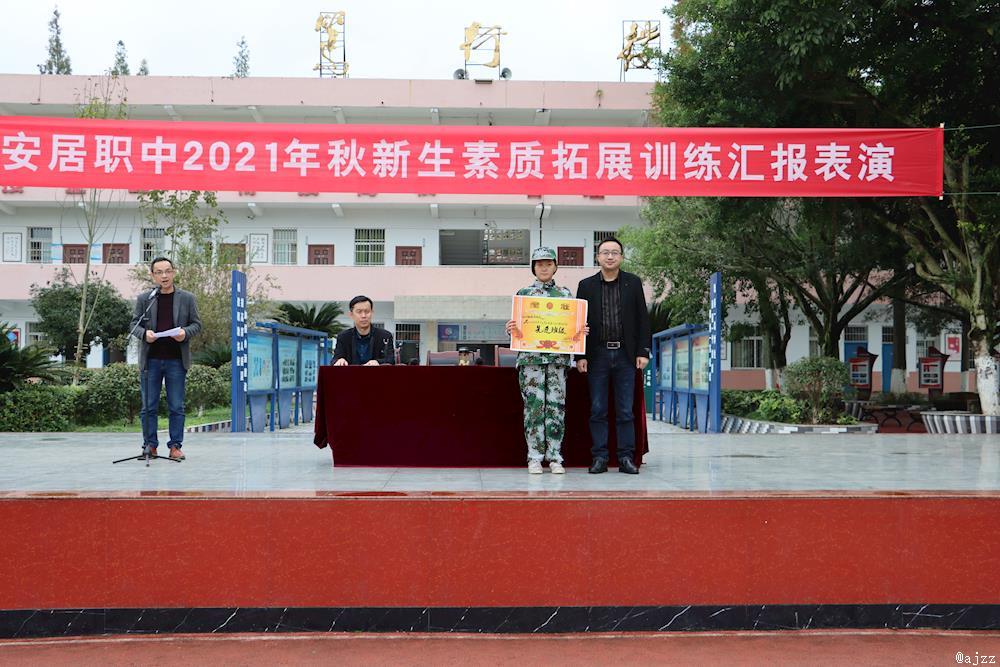 10月22日,我校2021年秋季新生素质拓展训练汇报表演在运动场隆重举行。学校党总支书记、校长杨洪斌,党总支副书记贺勇,9+3办主任唐兵,安居区人武部总教官王华出席活动,2021级秋200余名新生参加活动。
