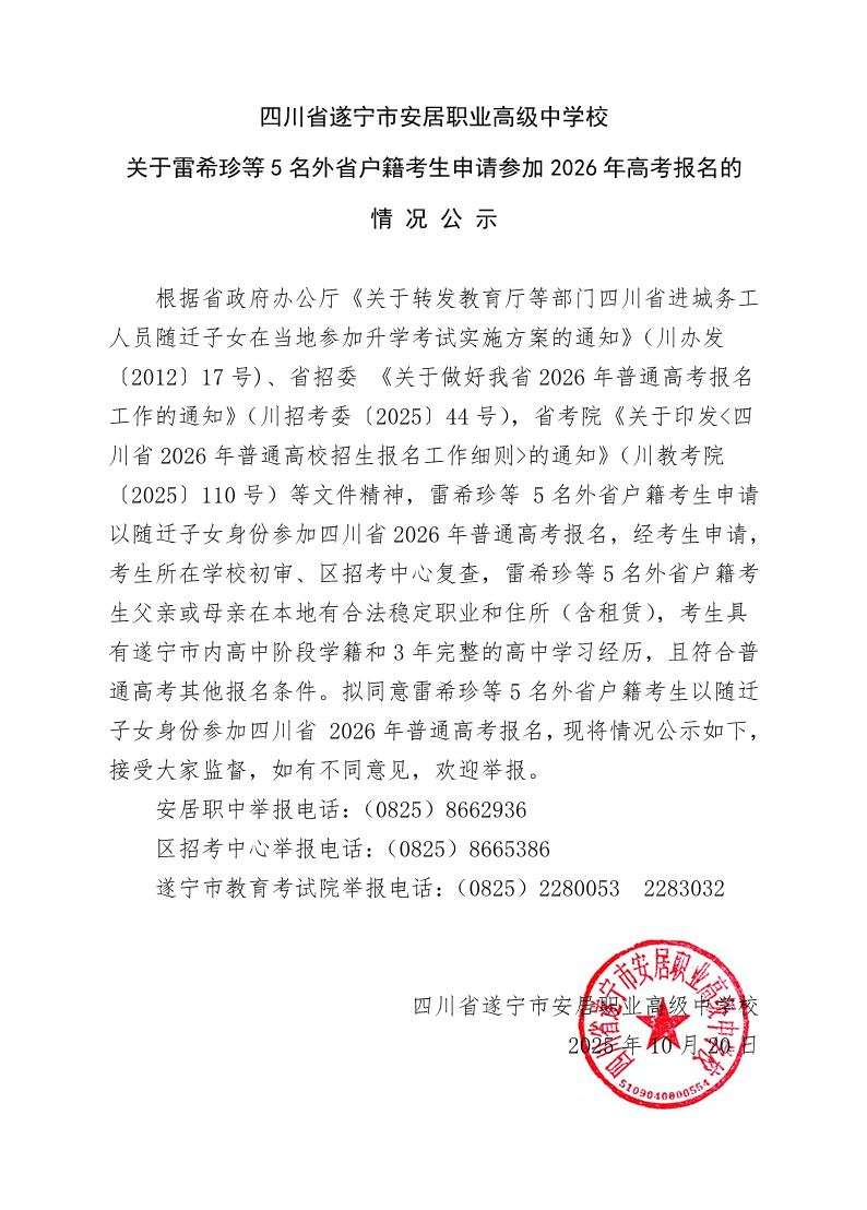 四川省遂宁市安居职业高级中学校关于雷希珍等5名外省户籍考生申请参加2026年高考报名的情况公示