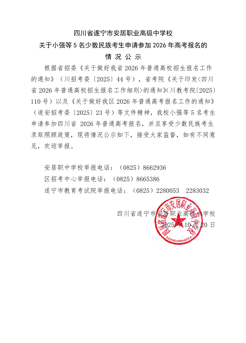 四川省遂宁市安居职业高级中学校关于小强等5名少数民族考生申请参加2026年高考报名的情况公示